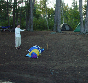 | Tony, or Anthony as many know him, is always very helpful on BWCA trips. This is evident above as he takes another load across a portage or when he points out to Jim that there are two perfectly nice, dry tents right over there where he could have spent the night. |